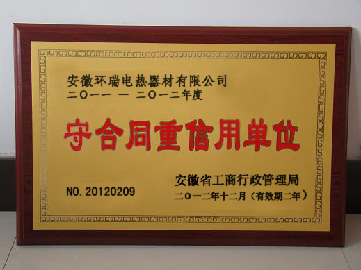 誠(chéng)信是企業(yè)可持續(xù)發(fā)展的基石。十多年來(lái),安徽環(huán)瑞電熱器材有限公司始終秉承“以人為本,以顧客為中心”的核心價(jià)值觀,恪守誠(chéng)信經(jīng)營(yíng)的理念,嚴(yán)格執(zhí)行《合同法》、《公司法》等法律法規(guī),不斷強(qiáng)化合同管理,完善合同管理制度,從根本上保證合同管理和履行的規(guī)范性。同時(shí),大力開展創(chuàng)造“守合同重信用”企業(yè)活動(dòng),營(yíng)造“守合同重信用”的良好氛圍,提高全體職工“守合同重信用”的自覺(jué)性和法制觀念,使企業(yè)合同管理不斷走向制度化、規(guī)范化、標(biāo)準(zhǔn)化。2011-2012年公司合同履行率100%。無(wú)任何違法、違約、違規(guī)及合同糾紛等不良行為,各合作單位對(duì)安徽環(huán)瑞的合同履行情況也都給予了高度評(píng)價(jià)。