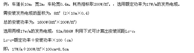 關于車道融雪化冰,為節省出資,不用在車道整個區域鋪設加熱電纜,通常裝置在車輪通過的當地就足夠了。可選用單位裝置面積功率為200~250W/㎡,并選用帶地上傳感器的溫控器來操控。