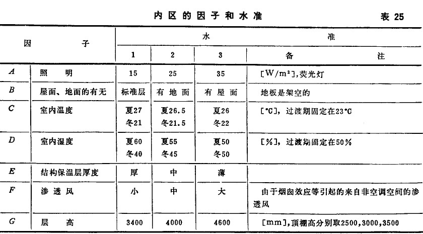 在表11中給出全年負荷計算方法的種類。在略算法中,根據(jù)實驗設計法利用推斷表的方法,是在對負荷的大小有影響的因素(例如窗面積比)的幾個水準(例如20%, 40%,60%三個水準)中選出一個,只要用簡單的加減運算便可求出負荷某種程度的增加或減少,因而是非常便利的。這里給出的是由日本建筑學會節(jié)能小委員會作成的表。