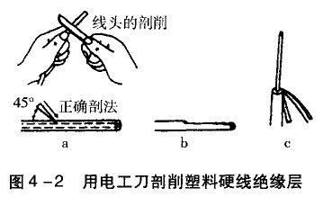 (2)接著刀面與芯線保持巧“角左右,用力向線端推削,不可切人芯線,削去上面一層塑料絕緣層.如圖4一2b所示。