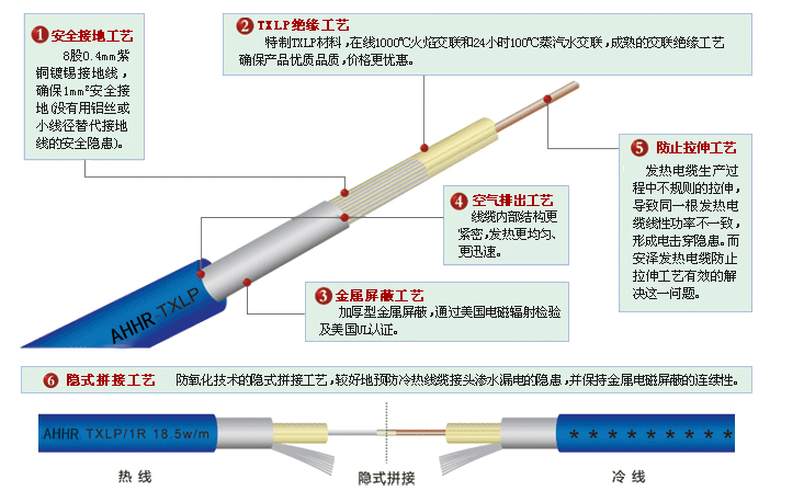 安徽環(huán)瑞研發(fā)了一種耐磨耐高溫型發(fā)熱電纜特點(diǎn):是在傳統(tǒng)發(fā)熱電纜結(jié)構(gòu)上增加了無(wú)色透明特氟隆絕緣層,與火焰及蒸汽交聯(lián)聚乙烯絕緣層構(gòu)成雙層絕緣,更安全。解決了因外界溫度過(guò)高導(dǎo)致線纜擊穿的問(wèn)題;解決了有傳統(tǒng)發(fā)熱電纜鋪設(shè)的地面上不能有覆蓋物的問(wèn)題。