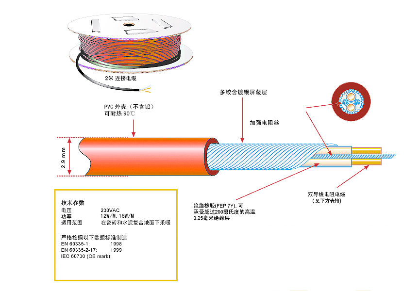環(huán)瑞最新研發(fā)3.7毫米直徑的雙導(dǎo)電地?zé)峋€-新型發(fā)熱電纜,可滿足5毫米-100毫米不同覆蓋厚度設(shè)計。