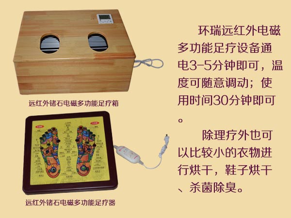 環(huán)瑞遠紅外鍺石電磁多功能足療器和遠紅外鍺石電磁多功能足療箱突破了以往足療器采用電動脈沖等原理,讓人們足底有震動感就能理療的假象。環(huán)瑞暖腳設備通電后產(chǎn)生17um的遠紅外光波穿過人體真皮組織對足部各個穴位進行效的輻射,促進人體的新陳代謝氣血運行、調(diào)節(jié)內(nèi)臟功能、舒通全身經(jīng)絡,從而達到祛病驅邪、益氣化瘀、滋補元氣的目的經(jīng)達以按摩治療的效果。