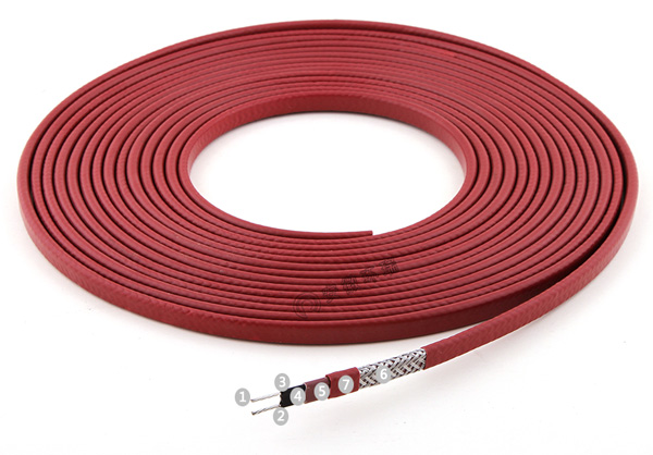 1、銅芯導(dǎo)線 2、低電阻過渡層 3、PTC芯帶 4、改性聚烯烴絕緣層 5、改性聚烯烴絕緣層 6、金屬屏蔽層 7、低煙無鹵外護套(可定制氟塑料護套)